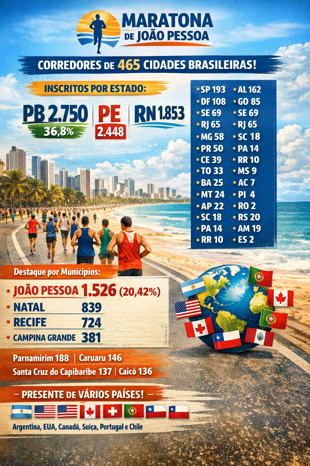 Ao todo, corredores de 465 cidades brasileiras estarão presentes. A maior concentração vem da própria Paraíba, com 2.750 inscritos, o equivalente a 36,8% do total, seguida por Pernambuco (2.448) e Rio Grande do Norte (1.853). O evento também atrai participantes de estados como São Paulo (193), Alagoas (162), Distrito Federal (108) e Goiás (85), além de visitantes de praticamente todas as regiões do país.